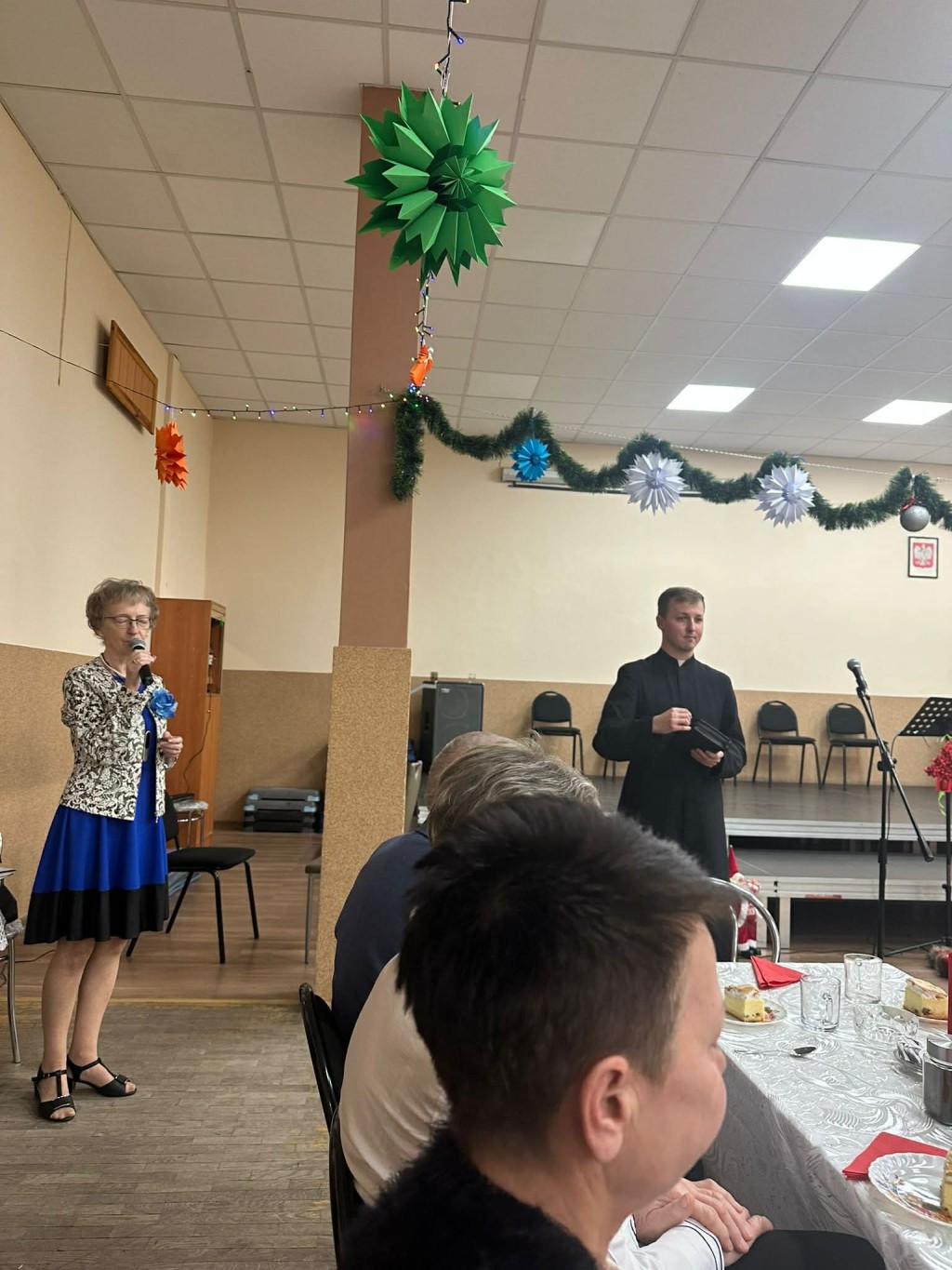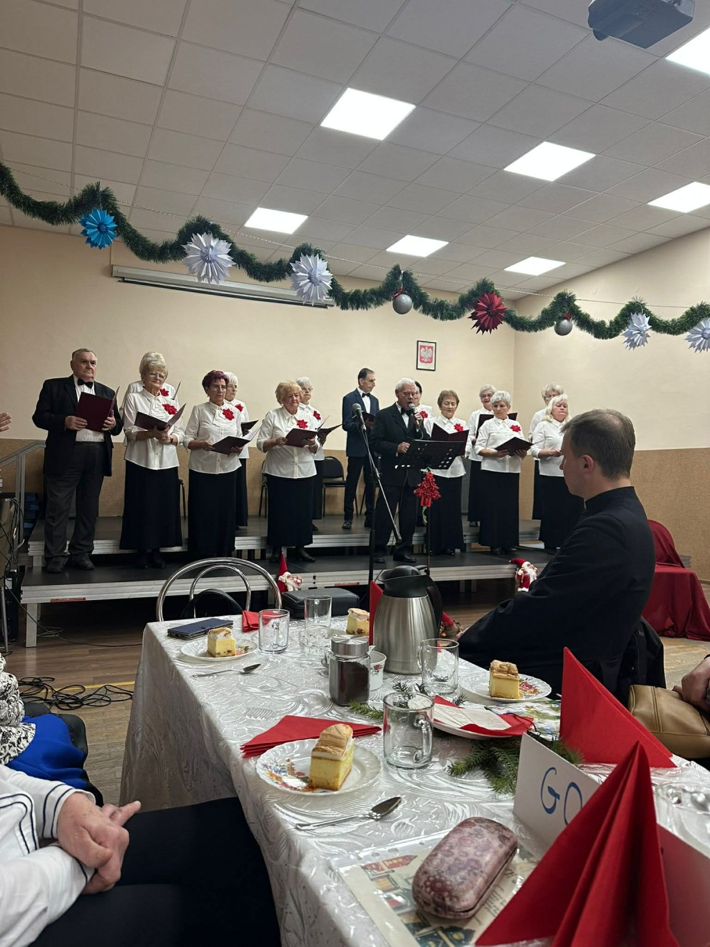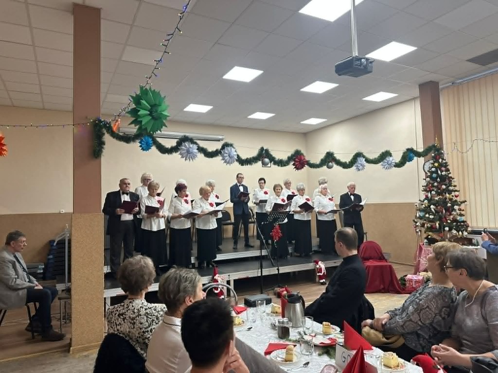 Uroczystość rozpoczęła się wspólnym powitaniem zaproszonych gości oraz obecnością księdza z parafii Kolbego, który skierował do uczestników serdeczne słowa, udzielił błogosławieństwa i wprowadził wszystkich w wyjątkowy nastrój zbliżających się Świąt Bożego Narodzenia. Na spotkaniu pojawiły się zaprzyjaźnione kluby seniora „Jarzębina” oraz „Brzoza” , co dodatkowo podkreśliło integracyjny charakter wydarzenia. Następnie seniorzy wspólnie śpiewali tradycyjne kolędy, co jeszcze bardziej podkreśliło świąteczny charakter spotkania. Po części oficjalnej odbył się wigilijny poczęstunek, przy którym uczestnicy mogli porozmawiać, podzielić się opłatkiem oraz złożyć sobie nawzajem świąteczne życzenia. Wspólne biesiadowanie sprzyjało integracji i radosnej atmosferze.